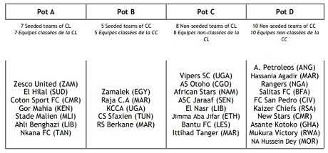 On suivra aussi le tirage au sort des barrages en CdC avec le Raja Casablanca, tenant du titre, le Zamalek et le CS Sfaxien en têtes d’affiche. Dans un premier temps, les 7 équipes du Pot A (les reversés de C1 les mieux classés) seront tirées au sort avec un adversaire du Pot D (les qualifiés de C2 les moins bien classés) puis les 5 équipes du Pot B (mieux classées de C2) seront opposées à un adversaire du Pot C (reversés les moins bien classés). Un dernier tirage aura ensuite lieu pour les équipes restantes dans les Pots C et D.