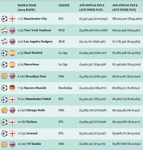 Avec un salaire annuel moyen de 6,44 millions d’euros par joueur (soit 124 500 euros par mois), les Citizens trustent la première place devant deux franchises américaines de baseball, les New York Yankees (6,41 millions d’euros par an) et les Los Angeles Dodgers (6,21 millions d’euros par an). Deux autres clubs de football très célèbres viennent compléter le Top 5 : le Real Madrid (6,05 millions d’euros par an) et le FC Barcelone (6,02 millions d’euros par an).