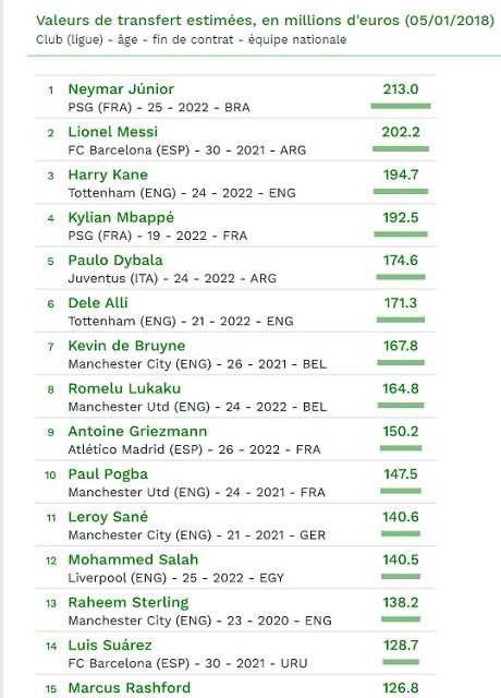 De belles performances en belles performances, l’ancien joueur de Chelsea est logiquement devenu le joueur africain le plus cher actuellement, révèle ce lundi l’Observatoire du Football-CIES. Acheté 42 millions d’euros l’été dernier, le Red est désormais évalué à 140,5 millions d’euros ! Cette valeur le place au 12e rang mondial, loin du leader, Neymar (213 M€) mais nettement devant le Nigérian de Leicester Wilfred Ndidi (77,4 M€), son coéquipier Sadio Mané (66,3 M€) ou encore Pierre-Emerick Aubameyang (64,7 M€). Autant dire que Salah démarre 2018 sur les chapeaux de roues !