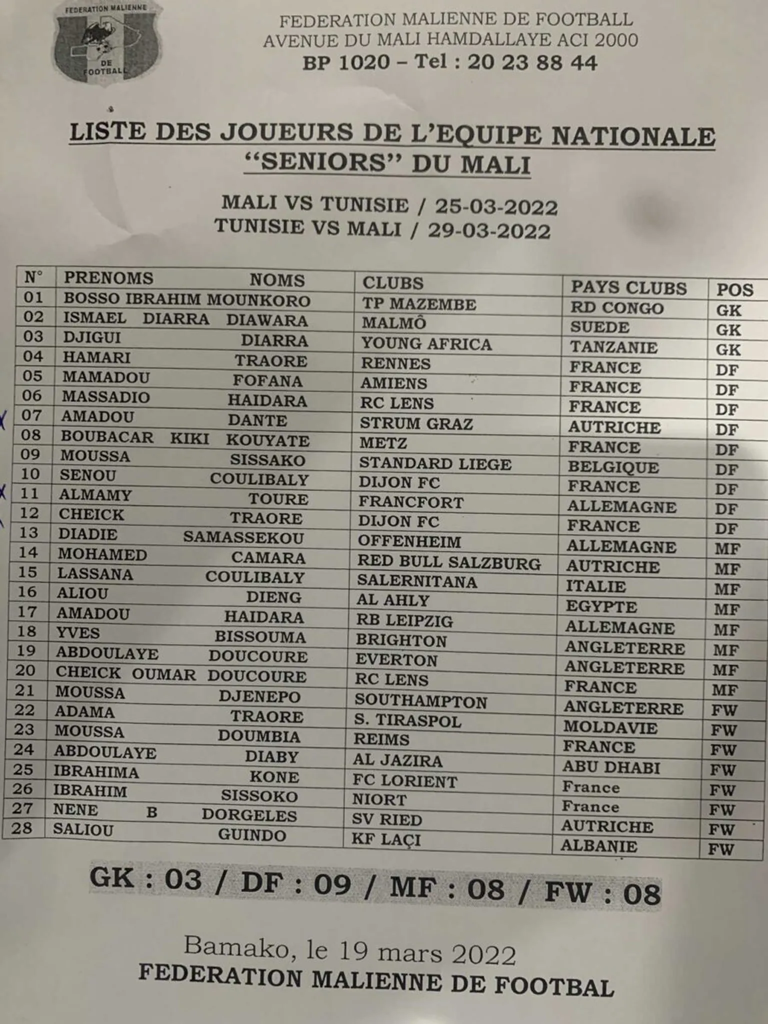 Maintenu mais encadré suite à l’élimination en 8es de finale de la CAN 2021 contre la Guinée Equatoriale, le sélectionneur du Mali, Mohamed Magassouba, a dévoilé ce samedi sa liste de 28 joueurs retenus pour affronter la Tunisie en barrages de la Coupe du monde 2022 les 25 mars (à Bamako) et 29 mars (à Radès).