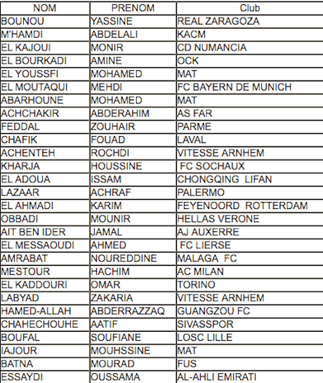Tout ça pour ça ! Après avoir dévoilé une présélection de 30 joueurs la semaine dernière, Badou Zaki, le sélectionneur du Maroc, a réduit sa liste finale à 28 éléments mardi. La principale information est le maintien des binationaux Sofiane Boufal (Lille) et Hachim Mastour (AC Milan) dans cette liste, ce qui sous-entend que les intéressés ont donné leur accord pour participer à la première journée des éliminatoires de la CAN 2017 contre la Libye le 12 juin. Marouane Chamakh (Crystal Palace), Mohamed Oulhaj (Raja Casablanca) et Marouane Saadane (FUS Rabat) sont les seuls à faire les frais de cette mini-réduction de la liste tandis qu’Oussama Assaidi, absent de la présélection, est appelé en renfort. Younès Belhanda (Dynamo Kiev), Youssef El Arabi (Grenade) et Abdelaziz Barrada (OM) sont toujours absents.