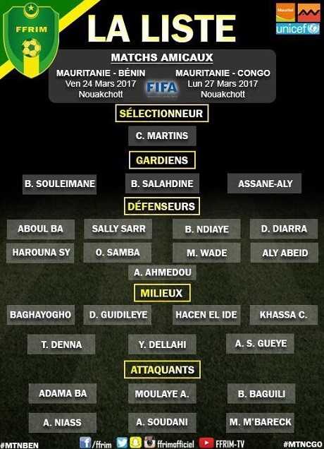 Conforté dans ses fonctions de sélectionneur de la Mauritanie et prolongé jusqu’en 2019, Corentin Martins a dévoilé ce vendredi une liste de 25 Mourabitounes pour les matchs amicaux face au Bénin (24 mars) et au Congo (27 mars) à Nouakchott. La principale information réside dans le retour du milieu offensif d’Auxerre Adama Ba après de longs mois de mise en retrait de la sélection. Si Abdoul Ba (Lens), Diallo Guidileye (Nancy) et Ahmed Bessam (Al Ansar) sont là, Ismail Diakité (Kaleej) manque en revanche à l’appel pour cause de blessure.