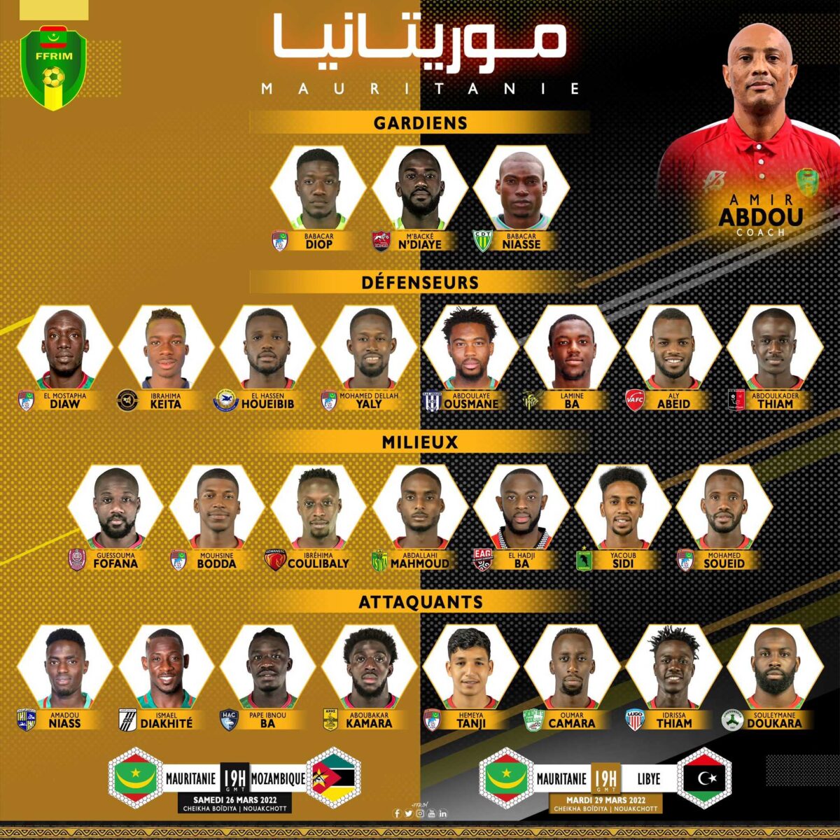 Récemment nommé sélectionneur de la Mauritanie, le Comorien Amir Abdou a dévoilé ce jeudi sa liste de 26 joueurs retenus pour affronter le Mozambique (26 mars) et la Libye (29 mars) en match amical au Stade Cheikha Boïdiya de Nouakchott.