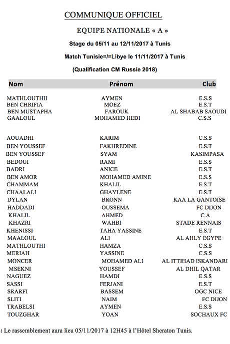En tête du groupe A des éliminatoires, la Tunisie n’aura besoin que d’un point face à la Libye le 11 novembre à Radès pour valider son billet pour le Mondial 2018 (une défaite peut même faire l’affaire si dans le même temps la RDC ne bat pas la Libye). Dans ce cadre, après avoir déjà dévoilé une liste composée exclusivement de joueurs locaux, déjà en stage, le sélectionneur des Aigles de Carthage, Nabil Maaloul, l’a complétée ce mardi en faisant appel à onze expatriés.