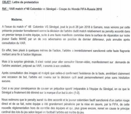 La première lettre se plaint des décisions arbitrales de M. Milorad Mazic contre la Colombie. La Fédération sénégalaise (FSF) estime que l’arbitre n’avait pas à annuler le penalty initialement sifflé pour une faute sur Sadio Mané puis annulé de manière très litigieuse après utilisation de l’assistance vidéo (VAR). L’instance réclame également un penalty pour une main non sifflée de Yerry Mina dans la surface colombienne. “Ces faits ayant été à l’origine directe de l’élimination du Sénégal nous ont motivé à vous saisir dans cette lettre de protestation, en espérant que toute la suite requise lui sera accordée“, a écrit la FSF.