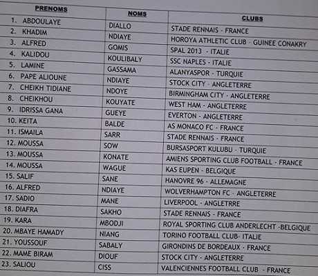 Attaquants : Moussa Sow, Moussa Konaté, Diafra Sakho, Sadio Mané, Ismaila Sarr, Mame Biram Diouf, Mbaye Niang, Diao Keita Baldé