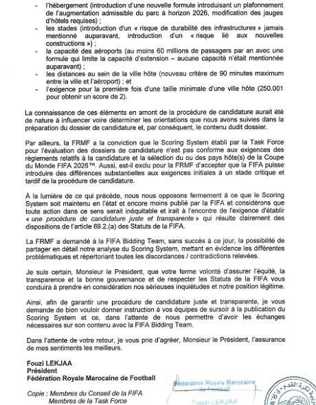 Au cours des dernières heures, le site InsideWorldFootball et l’AFP ont publié des extraits d’une lettre envoyée par la Fédération marocaine (FRMF) à la FIFA. Dans celle-ci, l’instance se plaint d’avoir été prévenue au dernier moment des changements de certains critères de notation pour élaborer son dossier de candidature à l’organisation du Mondial 2026. Ce mardi, la FRMF a confirmé l’envoi de ce courrier qu’elle a publié en intégralité sur son site officiel. Sommée par le Maroc de donner des explications à ce sujet, la réponse de la FIFA est désormais attendue.