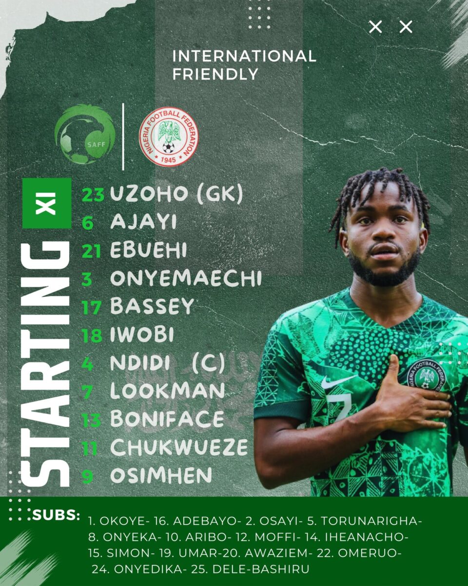 Le premier acte a clairement été à l'avantage des Super Eagles, plus remuants, mais dont les centres-tirs à répétition, parfois relâchés par le gardien adverse, n'ont pas permis de trouver la faille. Les hommes de Victor Peseiro ont surtout péché par manque d'efficacité, à l'image de Chukwueze, incapable de trouver le cadre à la retombée d'un centre-tir d'Onyemaechi relâché. Lookman, mis en échec par le portier adverse, a également gâché une belle opportunité avant la pause, tandis que le tir en pivot d'Osimhen passait juste au-dessus. Les Nigérians auraient pu payer ces ratés mais Uzoho sauvait les meubles en sortant devant Fahad.