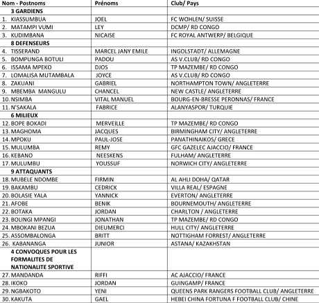 Marquée par la stabilité, la liste comporte toute de même les retours notables de N’Sakala et du capitaine Mulumbu ainsi que ceux des binationaux Afobe et Assombalonga qui auront peut-être enfin l’occasion d’étrenner leur première cape. Oualembo, Mabwati, Bokila et Lukebakio sortent en revanche du groupe. A noter les convocations de Rifi Mandanda (AC Ajaccio), Jordan Ikoko (Guingamp), Yéni Ngbakoto (QPR) et Gaël Kakuta (Hebei Fortune) uniquement pour régler des formalités administratives liées à leur changement de nationalité sportive, mais ces quatre joueurs ne pourront pas prendre part à la rencontre. Les Léopards sont attendus le 7 novembre à Kinshasa pour le début du regroupement. Une liste finale de 23 joueurs sera ensuite établie après une double opposition contre le Racing Club de Kinshasa et Vita Club le 8 novembre.