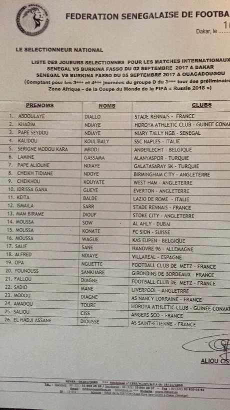 Invité à commenter sa liste, Cissé a rassuré sur l’état de forme de son capitaine Kouyaté, blessé avec West Ham durant la pré-saison. “J’ai eu une discussion avec lui et il m’a rassuré. Il m’a fait savoir qu’il est prêt à rejoindre la sélection. C’est vrai qu’il revient d’une blessure mais j’ai confiance à son état de santé et je pense qu’il fera partie du groupe de West Ham la prochaine journée“, a rassuré le technicien, qui a également envoyé un message à Mame Biram Diouf, convoqué bien qu’il soit désormais utilisé comme ailier voire piston par Stoke City.