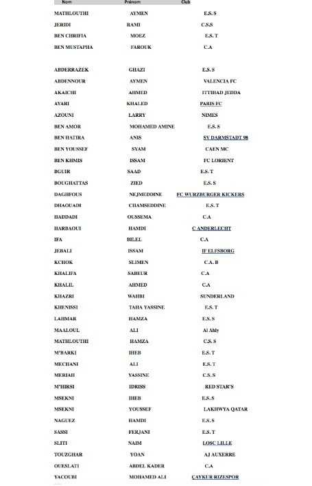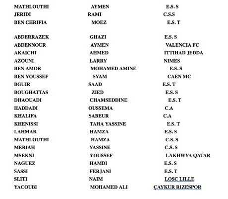 Le regroupement débutera le 25 décembre puis les Aigles de Carthage se prépareront ensuite en Espagne où ils affronteront la sélection de Catalogne à Barcelone (28 décembre) et celle du Pays basque à Bilbao (30 décembre). Notons que Kasperczak a publié une autre liste réduite à 23 joueurs pour ce rassemblement à l’étranger, en se passant notamment de Khazri, qui ne sera libéré que début janvier par son club, de Maaloul et de Ben Hatira.